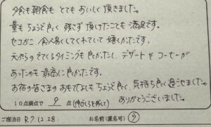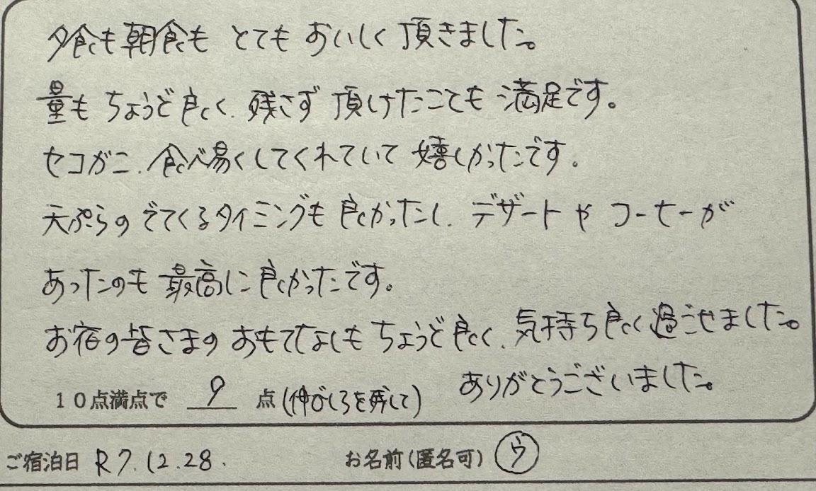 夕食も朝食もとてもおいしく頂きました。量もちょうど良く、残さず頂けたことも満足です。セコガニ、食べ易くしてくれていて嬉しかったです。天ぷらのでてくるタイミングも良かったし、デザートやコーヒーがあったのも最高に良かったです。お宿の皆さまのおもてなしもちょうど良く、気持ち良く過ごせました。ありがとうございました。