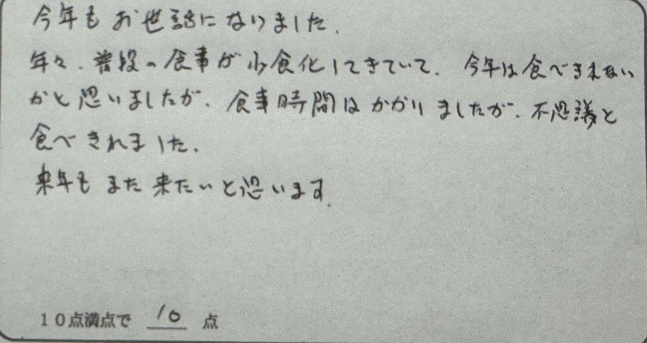 今年もお世話になりました。年々、普段の食事が少食化してきていて、今年は食べきれないかと思いましたが、食事時間はかかりましたが、不思議と食べきれました。来年もまた来たいと思います。(愛媛県Y様 ご夫婦旅行 2025.12.29. ぷりっぷり食感☆活柴山かにの刺身付!“いい旅プラン 基本P”<香住>)