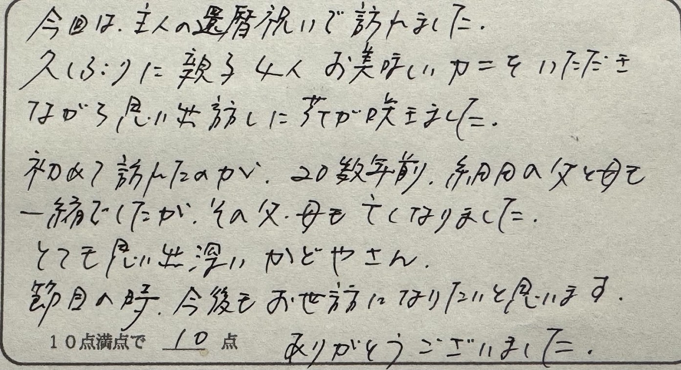 H様。この度は民宿美味し宿かどやへの久しぶりのご来館、誠にありがとうございました。節目節目に当館をご利用いただけていること、大変感謝いたします。家族でカニ鍋を囲むことは最高のご馳走かと思います。これからもぜひ、ご家族皆さんでカニ料理をお楽しみ下さいね。またのお越しをお待ちしております。ありがとうございました。