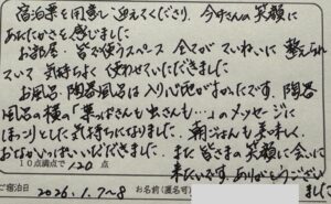 宿泊票を用意で迎えてくださり、今井さんの笑顔にあたたかさを感じました。お部屋・皆で使うスペース、全てがていねいに整えられていて気持ちよく使わせていただきました。お風呂、陶器風呂は入り心地がよかったです、陶器風呂の横の「葉っぱさんも虫さんも・・・」のメッセージにほっこりとした気持ちになりました、朝ごはんも美味しく、 おなかいっぱいいだだきました。また皆さまの笑顔に会いに来たいです。ありがとうございました。(兵庫県H様 ご夫婦旅行 2026.1.7. ぷりっぷり食感☆活柴山かにの刺身付!“いい旅プラン 基本P”<香住>)