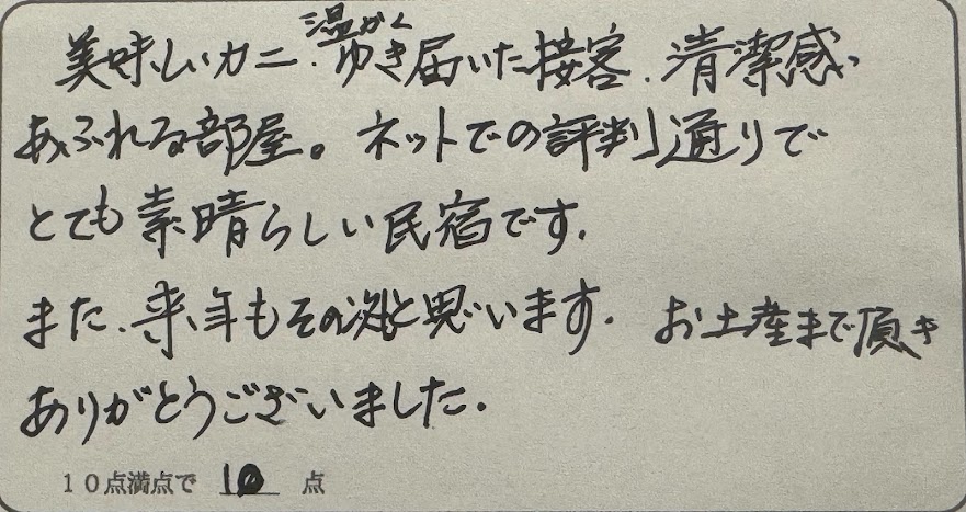 Y様。この度は民宿美味し宿かどやをご利用いただきまして、誠にありがとうございました。良いお天気の中、列車も時間通り動いており、山陰列車旅もお愉しみいただけたのではないでしょうか。旅情とともに愉しむカニ料理。冬の日本海の味覚です。これからもこの時期にはぜひ、お越し下さいませ。またのお越しをお待ちしております。ありがとうございました。