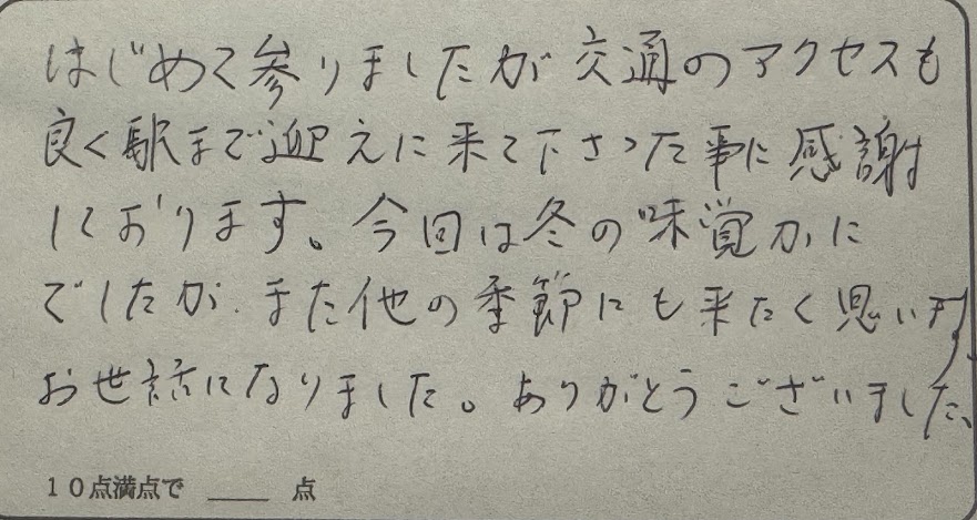 S様。この度は民宿美味し宿かどやをご利用いただきまして、誠にありがとうございました。昔に比べ、列車の本数は減ってきていますが、近くに佐津駅があるというカニ料理をお召し上がりいたくける地域の中では、便利な集落の一つではあると自負しております。何にもない田舎町ですが、それが日本海での旅情をお愉しみいただ木、カニ料理をより美味しく感じていただける一つでもあるかと思います。春や秋には別のカニ(香住ガニ)も提供しておりますので、ぜひまたお越し下さいませ。またのお越しをお待ちしております。ありがとうございました。