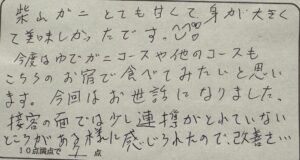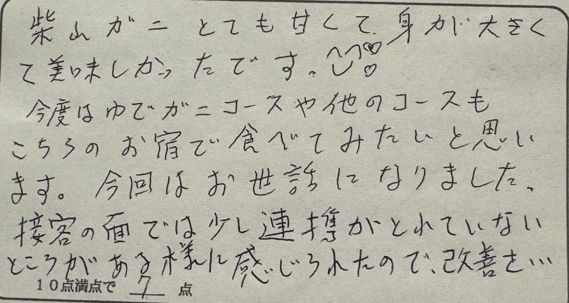 S様。この度は民宿美味し宿かどやへお越しいただきまして、誠にありがとうございました。1月に入り、船の出航回数が少なく、特選プランでお出しできるカニが仕入れられるかドキドキだったところ、まさに16日の朝の競りでゲットできました。とても良い柴山ガニだったと思います。ご満足いただけたようであれば、とても嬉しいです。接客の連携。何か、不手際があったでしょうか。スタッフに確認したところ、最後のデザートをお部屋にお持ちすることになったぐらいしか思い当たらなかったとのことです。洗練した接客はできないかもしれませんが、美味しいカニを食べたくなったら、ぜひまた民宿かどやを思い出してくださいね。またのお越しをお待ちしております。ありがとうございました。