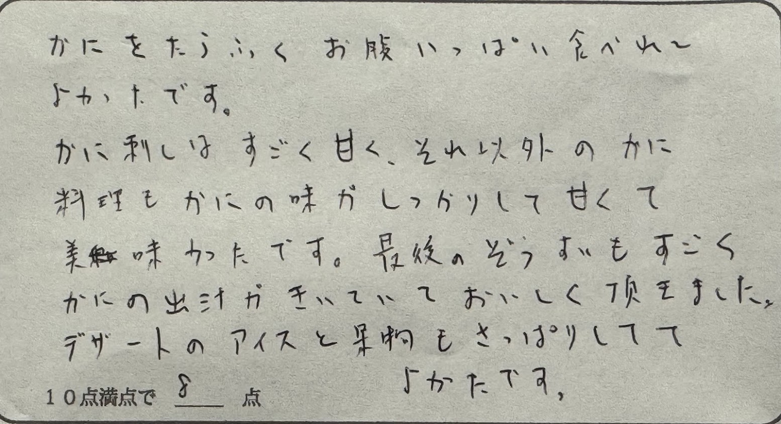 Y様。この度は民宿美味し宿かどやにご来館いただきまして、誠にありがとうございました。カニ料理、ご満足いただけたようで良かったです。事前の打ち合わせでこちらももっと詳しく確認しておけば良かったと思う点があり、申し訳ありませんでした。一度ご利用いただけたら、どのようなプランかを理解し、次のリクエストにも活かしていただけると思います。旅行は予約した時から始まっています。次回はしっかりお打ち合わせさせていただきたいと思います。またのお越しをお待ちしております。ありがとうございました。