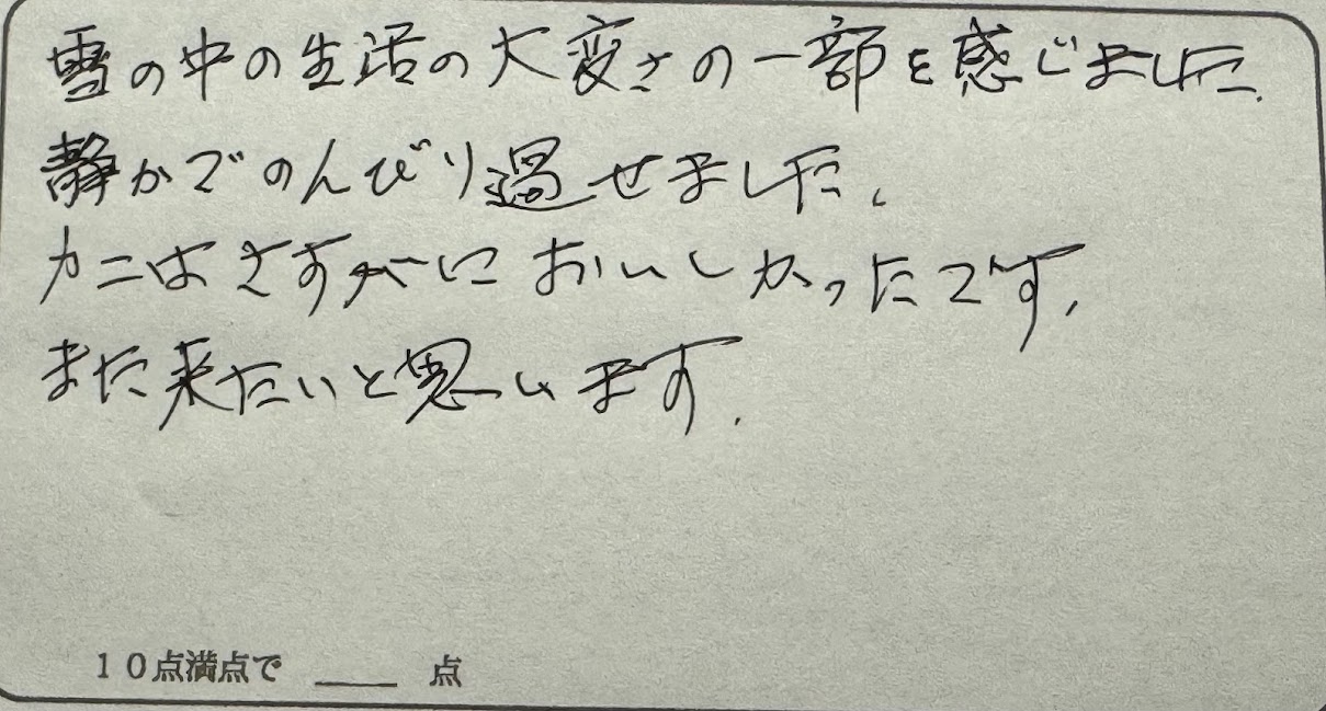 雪の中の生活の大変さの一部を感じました。静かでのんびり過せました。カニはさすがにおいしかったです。また来たいと思います。(兵庫県Y様 大人の親子旅 2026.1.23. ぷりっぷり食感☆活柴山かにの刺身付!“いい旅プラン 基本P”<香住>)