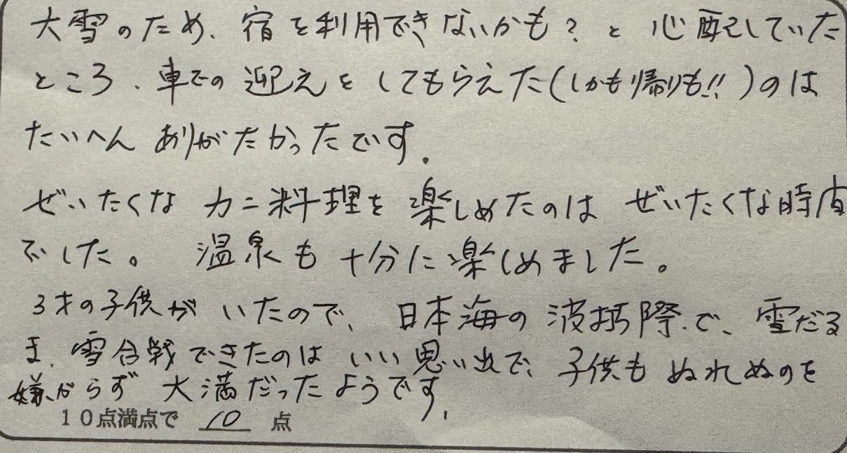 S様。この度は民宿美味し宿かどやへのお久しぶりのご来館、誠にありがとうございました。城崎温泉以西の列車が運休する大寒波、大雪。前泊で豊岡にお越しいただいていたのが良かったです。豊岡駅までお迎えにあがることで、今回はみなさん全員でカニ料理をお楽しみいただけたと思います。前回は夏の海でしたが、今回は冬の海をご覧いただきました。同じ海でも夏と冬で全く風景が異なることも実感していただけたと思います。遠路お越しいただき、海もご覧いただけたのは良かったです。機会があればカニも海もぜひ、また楽しみに来て下さいね。又のお越しをお待ちしております。ありがとうございました。