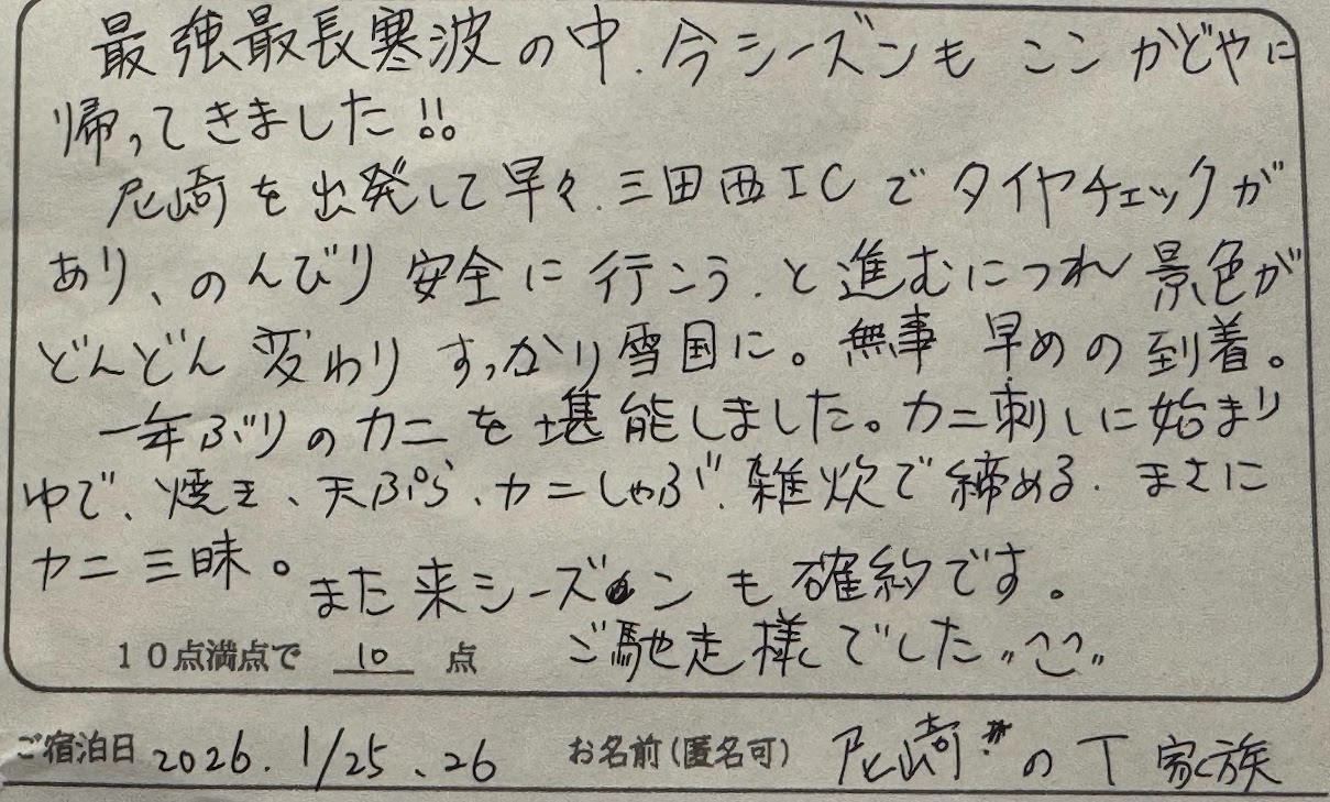 T様。いつも民宿美味し宿かどやご利用いただきまして、誠にありがとうございます。今年は大寒波の期間中にすっぽり入ってしまいましたね。それでも、お帰りの日は雪が降ることなく、道路の雪もとけていて良かったです。いい旅プランフルコース、今年もガッツリおひとり様3ばい堪能していただきましたね!!引き続き来シーズンもお越しをお待ちしております。安全運転でお越し下さいね。ありがとうございました。