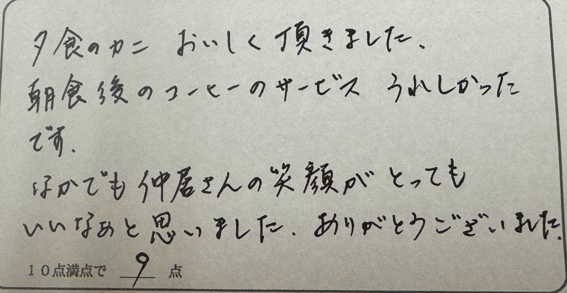 O様。この度は民宿美味し宿かどやへご来館いただきまして誠にありがとうございました。お天気が心配される時期でしたが、寒波の中休みのタイミング、この時期としては良いタイミングでお車にてお越しいただけたと思います。カニもご満足いただけたようでよかったです。また、スタッフの笑顔をお褒めいただきありがとうございます。とても励みになります。これからも笑顔を絶やさぬよう、元気に続けて参りますので、ぜひまたお越し下さいね。またのお越しをお待ちしております。ありがとうございました。
