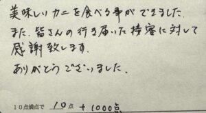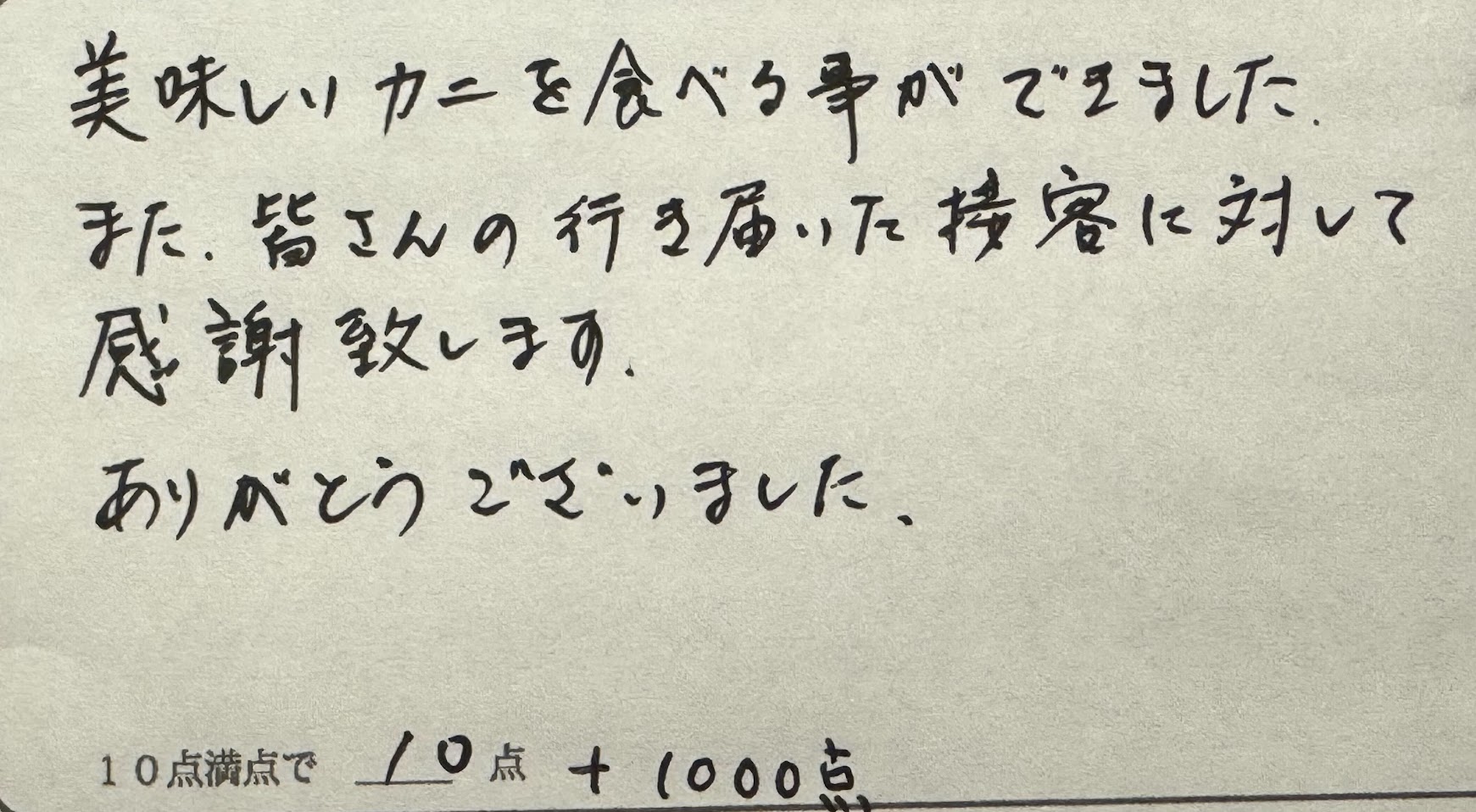 I様。この度は民宿美味し宿かどやへご来館いただきまして誠にありがとうございました。大雪の予報が出ていましたので、不安な中お越しいただいたことと思います。幸い大雪とはならず、カニ料理を堪能していただけたこと、大変嬉しく思います。美味しいカニを食べにぜひまた香住へ、かどやへお越し下さいね。またのお越しをお待ちしております。ありがとうございました。
