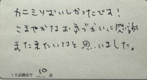 T様。この度は民宿美味し宿かどやへご来館いただきまして誠にありがとうございました。当館のカニ料理、堪能していただけてよかったです。特に甲羅みその炭火焼は、この一品を楽しみにお越しいただいているお客様も多い人気のカニ料理です。カニ身を絡めてお召し上がりいただくと、もう最高です!!是非ともまたこのカニ料理を食べにお越しくださいね。またのお越しをお待ちしております。ありがとうございました。