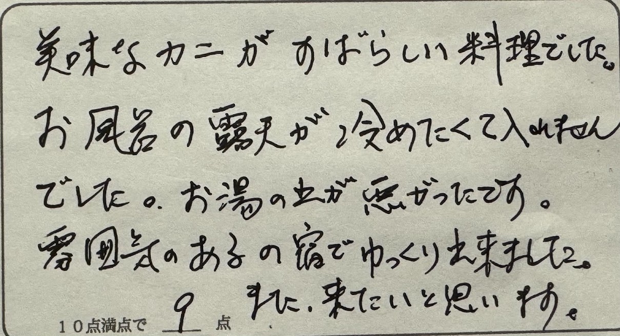 M様。この度は民宿美味し宿かどやへご来館いただきまして誠にありがとうございました。カニ料理、ご堪能いただけて良かったです。露天風呂の湯温、申し訳ありませんでした。露天ゆえ、葉っぱが循環栓を塞いだり、雪が入ってしまうことで、稀にぬるくなってしまうことがあります。可能であれば他のお客様のためにも、お風呂上がりすぐにご指摘いただけますと幸いです。何もない田舎町の平凡な民宿です。その雰囲気を気に入っていただけたのであれば幸いです。これからも自然体でまいりたいと思います。またのお越しをお待ちしております。ありがとうございました。