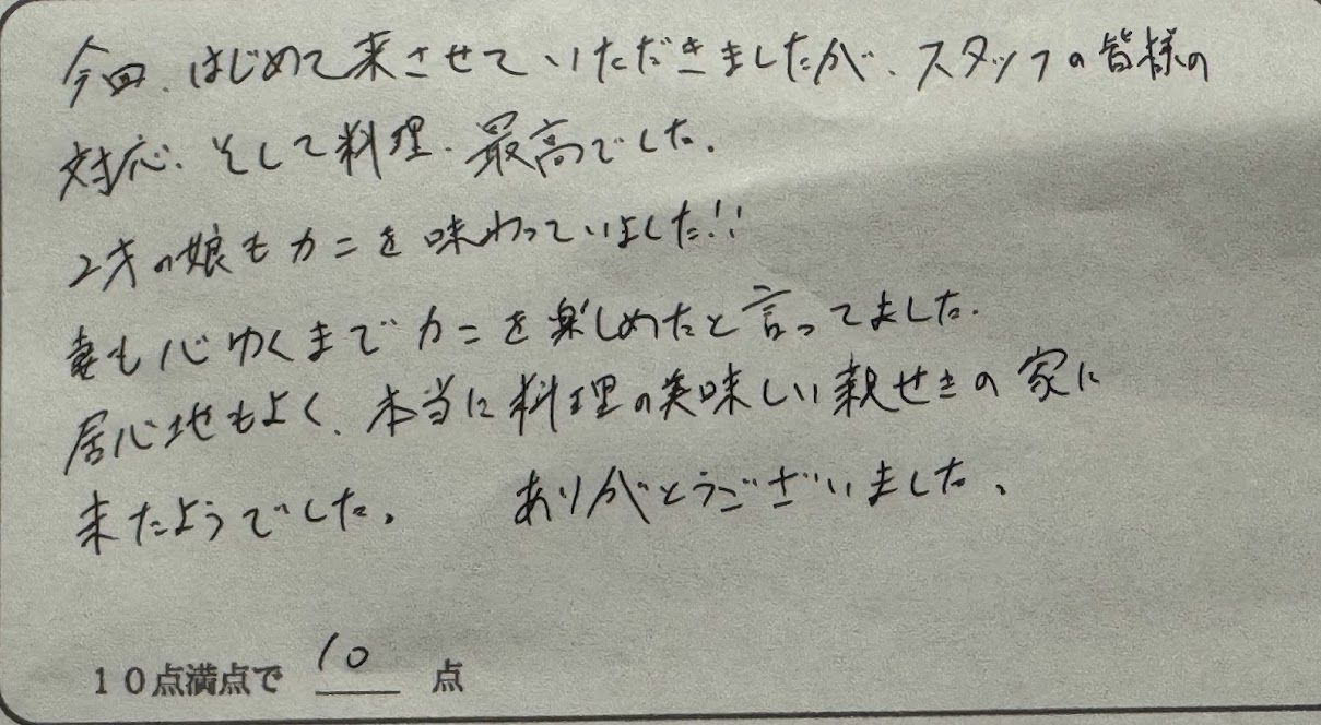 Y様。この度は民宿美味し宿かどやをご利用いただきまして、誠にありがとうございました。また今回は娘さんのカニデビュー(ですよね?)の場として、民宿かどやをお選びいただけたこと、大変嬉しく思います。ご家族でカニ三昧、満足していただけたようで良かったです。これからもお腹いっぱいカニを食べたくなったら、民宿かどやのことを思い出して下さいね。親戚の家のように気軽にお越し下さいませ。またのお越しをお待ちしております。ありがとうございました。