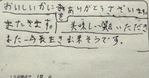F様。この度は民宿美味し宿かどやにご来館いただき、誠にありがとうございました。カニ料理、堪能していただけたようで良かったです。毎年、この時期には香住で、かどやでカニを食べることをぜひ楽しみにしていただきたく思います。ぜひまたみなさん揃ってお越し下さいね。又のお越しをお待ちしております。ありがとうございました。