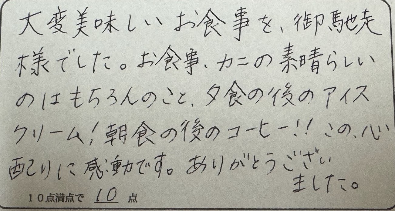 T様。この度は民宿美味し宿かどやへのご来館、誠にありがとうございました。カニ料理、満足していただけてよかったです。アイスクリームやコーヒー、ささやかなおもてなしではありますが、気楽にお過ごしいただける場を提供できていたのであれば嬉しいです。カニを食べたくなったらぜひ、民宿かどやを思い出して下さいね。又のお越しをお待ちしております。ありがとうございました。