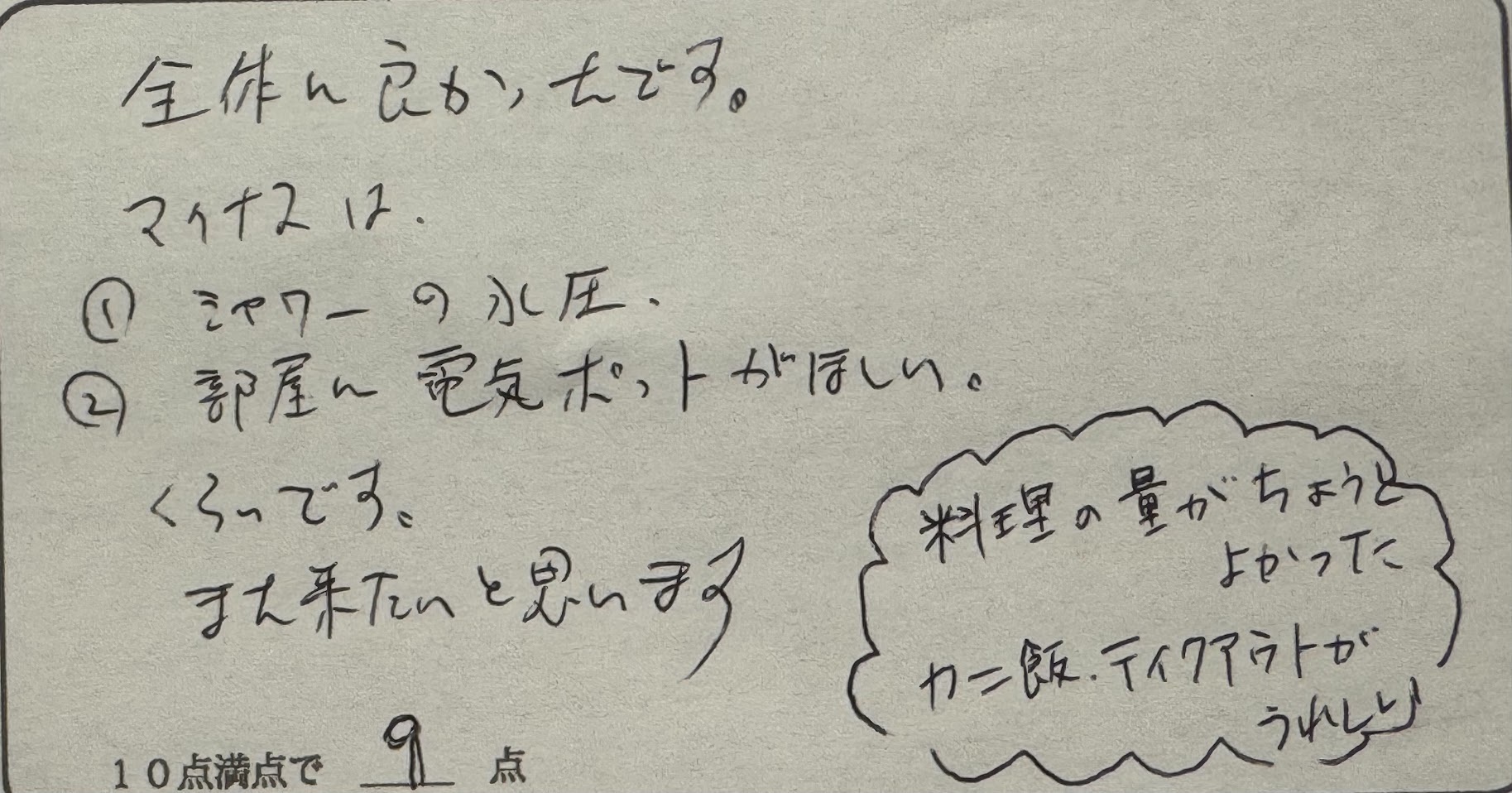 K様。この度は民宿美味し宿かどやへご来館いただきまして誠にありがとうございました。当館のカニプランは冬の松葉ガニプランも、春秋の香住がにプランも、選んだプランでボリュームを調整できます。美味しさだけでなく、適正量も気に入っていただけて良かったです。シャワーの水圧は申し訳ありません。立て替えないと無理、と工務店さんに言われてしまいましたので、築年数の古い当館の特徴だと思ってご察し下さい。またのお越しをお待ちしております。ありがとうございました。