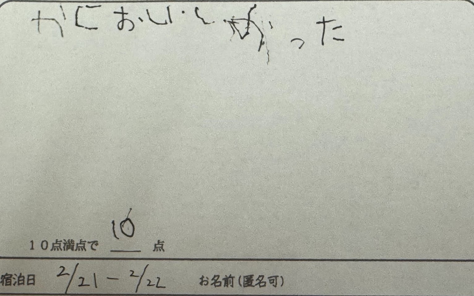 W様。この度は民宿美味し宿かどやをご利用いただきまして、誠にありがとうございました。ひょっとしてカニデビュー(ですよね?)でしたか?民宿かどやをお選びいただけたこと、大変嬉しく思います。これからもお腹いっぱいカニを食べたくなったら、民宿かどやのことを思い出して下さい。美味しいカニを用意してお待ちしてます。またのお越しをお待ちしております。ありがとうございました。