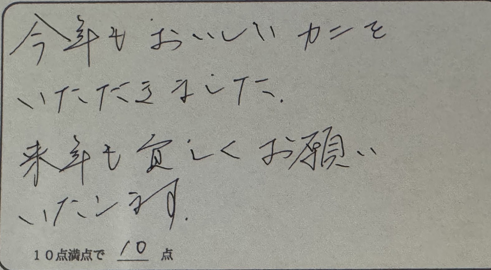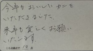 K様。いつも民宿美味し宿かどやにお越しいただきまして、誠にありがとうございます。2月も下旬になりますとお天気も海況も安定してきて、良質の柴山ガニが入手しやすくなっています。ご満足いただけるカニをお出しできたと思います。来シーズンも今の時期が狙い目です。ぜひまたお越し下さいね。またのお越しをお待ちしております。ありがとうございました。