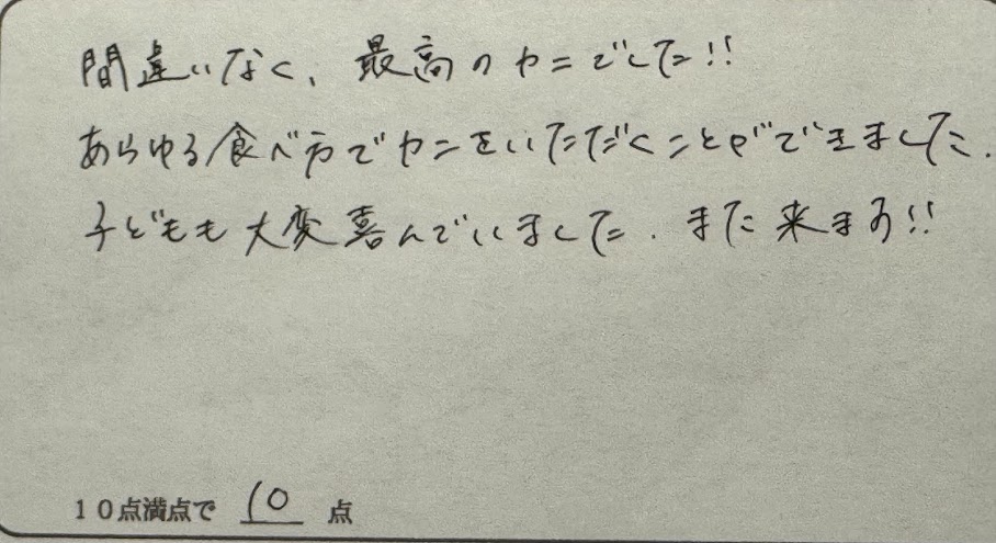 B様。いつも民宿美味し宿かどやにご来館いただき、誠にありがとうございます。また、今回は三世代での親族旅行を企画していただき、ありがとうございます!!遠路からもお越し頂き、皆さん、カニ料理を喜んでいただけたのであれば幸いです。1種類のカニですが、焼き、鍋、刺身、天ぷら、茹でなど様々な調理方法でのお料理を体験できるのが当地のカニ三昧プランです。年に一度の日本海へのカニ旅行。ぜひまた皆さんでお越し下さいね。又のお越しをお待ちしております。ありがとうございました。
