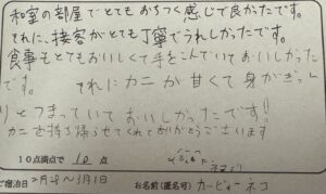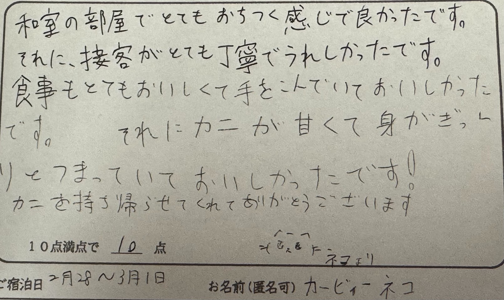 カービィーネコ様。この度は民宿美味し宿かどやにご来館いただき、誠にありがとうございました。甘くて身がぎっしりのカニ、ご満足いただけたようで良かったです。ご家族の皆様でカニ旅行を企画される際にはぜひまた民宿かどやをご検討下さいね。又のお越しをお待ちしております。ありがとうございました。