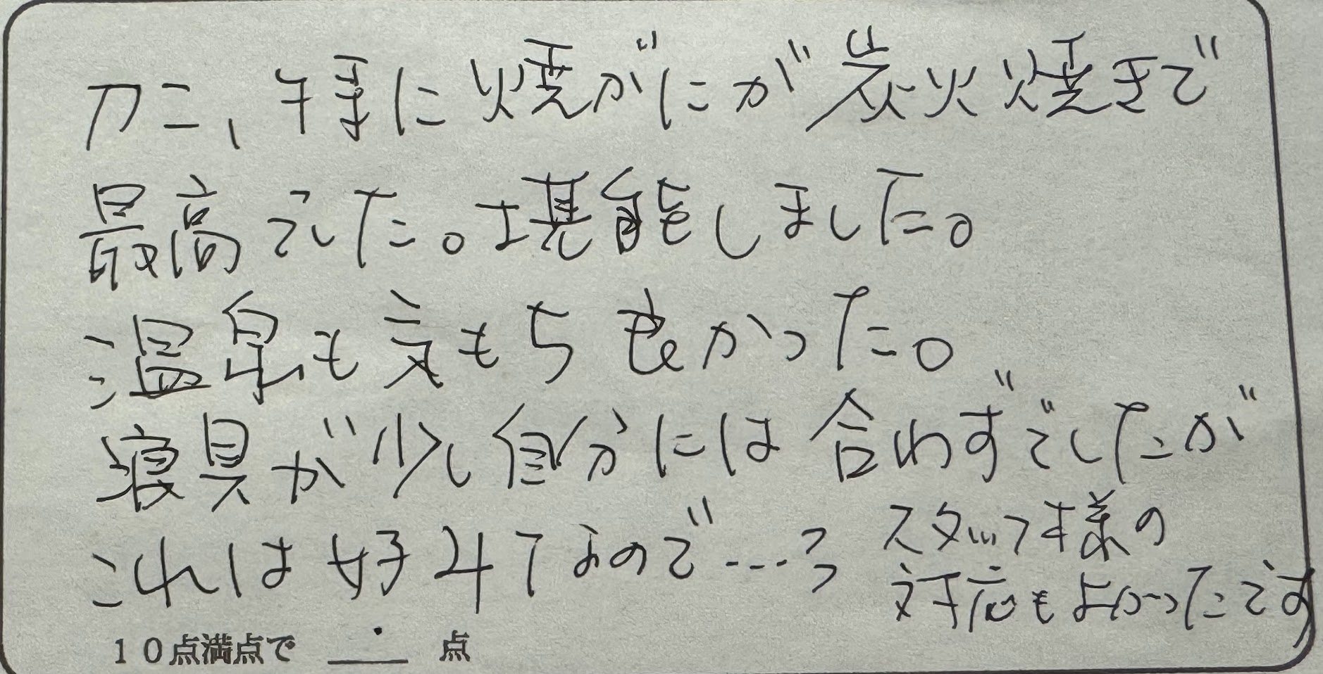 I様。この度は民宿美味し宿かどやへご来館いただきまして誠にありがとうございました。当館で一番人気なのが炭火で焼く焼きガニです!!あの香ばしい甘さは、お越しいただくからこそ熱々かつ美味しいタイミングでお召し上がりいただけます。お布団の件は敷布団に関して色々と考えていかないといけなくなっていることは実感しています(羽毛の掛け布団は大変ご好評いただいています!)。今後も設備面に関して色々と考えていきたいと思っています。年に1回のカニ旅行、ぜひまたお越しくださいませ。またのお越しをお待ちしております。ありがとうございました。