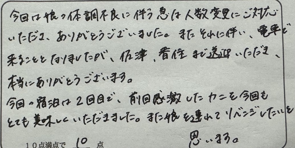 K様。この度は民宿美味し宿かどや2度目のご来館、誠にありがとうございました。直前のお子様の体調不良、大変だったかと思います。それでも当館へお越しいただいたこと、大変嬉しく思います。本来ならば日程変更も検討させていただきたいところでしたが、さすがにカニシーズン最終の週でしたのでそれもできなかったですね。来シーズンはぜひ、お子様ともども、ご家族揃ってお越しくださいね。次回のお越しをお待ちしております。ありがとうございます。