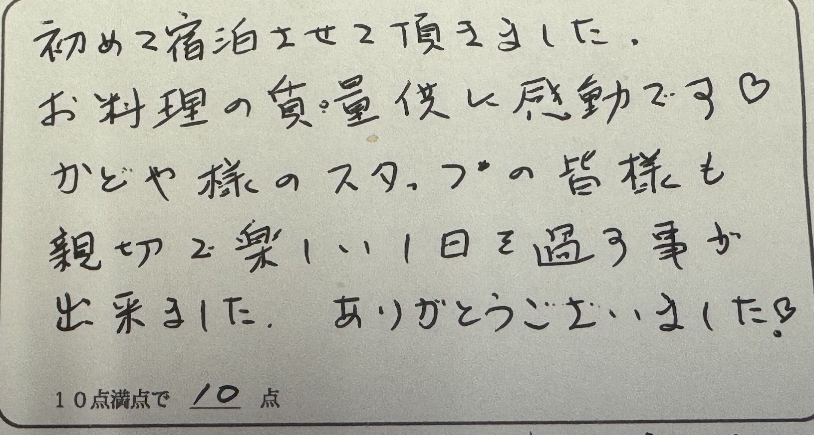 U様。この度は民宿美味し宿かどやへご来館いただきまして誠にありがとうございました。ご家族での春のカニ旅行。お腹いっぱいになってもらってご満足いただけて良かったです。これぞ、香住の民宿「カニ三昧」を体感していただけたのであれば、とても嬉しいです。3月も下旬になれば、行楽日和でもあります。次のシーズン以降もぜひ、ご家族でのカニ旅行を企画して下さいね。またのお越しをお待ちしております。ありがとうございます。