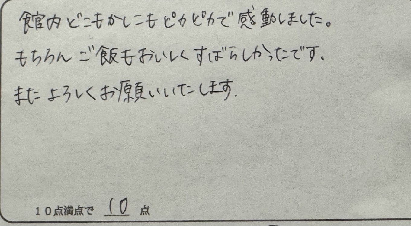 S様。この度は民宿美味し宿かどやへのご来館、誠にありがとうございました。お料理だけでなく、館内の清潔面もお褒めいただき、ありがとうございます。古い家屋ですが、日々清掃しているスタッフの励みにもなります。今後も清潔さは大切にしてまいります。また、次回は香住がにプランでもご来館を検討していただけている旨、お話いただいたこともとても嬉しかったです。次回のお越しをお待ちしております。ありがとうございました。