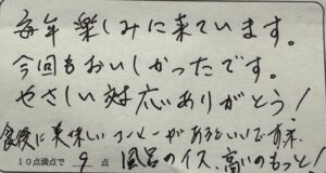 毎年楽しみに来ています。 今回もおいしかったです。 やさしい対応ありがとう!食後に美味しいコーヒーがあるといいですネ。風呂のイス、高いのもっと!(徳島県I様 ご夫婦旅行 2026.4.4. かにプラン定番、迷ったらこれ!! ”香住ガニ2.5はい付フルコース”)