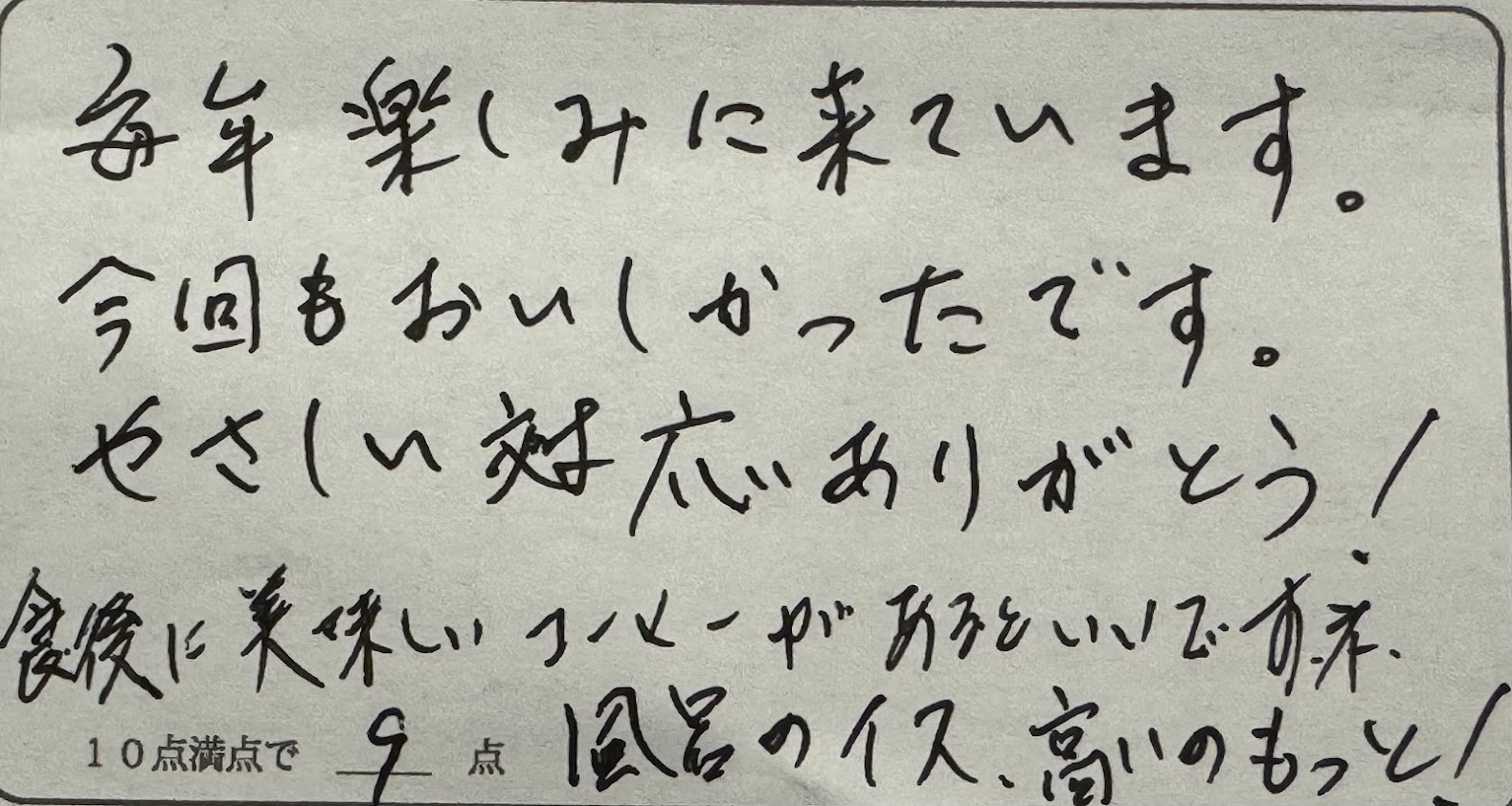 I様。いつも民宿かどやをご利用いただきまして、誠にありがとうございます。今回でもう6度目ですね!!直前で2はいプランを2.5はいプランに変更されたのは正解だったでしょうか。春の香住がに、ご堪能いただけたことと思います。お部屋でのコーヒーサービスは冬季のみとなっております。申し訳ありません。お風呂の椅子ですが、通常サイズのものと最も高いサイズのものを置いています。おそらくあれ以上高いものは既製品ではないかと・・・引き続き、またのお越しをお待ちしております。ありがとうございました。