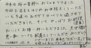 H様。この度は民宿かどやを2度目のご来館、誠にありがとうございました。前回は5月、今回は4月。桜のシーズンにお越しいただきました。お車からドライブ中に道中各所で見られる桜、お帰りの日はお天気も良く、キレイだったと思います。春のカニである香住ガニとともに当館でのご滞在もゆっくりしていただけたようで良かったです。引き続き、この時期のお越しをお待ちしております。ありがとうございました。