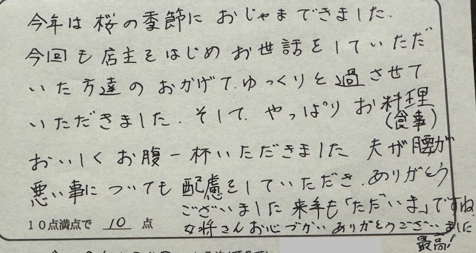 今年は桜の季節におじゃまできました。今回も店主をはじめお世話をしていただいた方達のおかげで、ゆっくりと過させていただきました。そして、やっぱりお料理 (食事) おいしくお腹一杯いただきました。夫が腰が悪い事についても配慮をしていただき、ありがとうございました。来年も「ただいま」ですね。 女将さんお心づかいありがとうございました。最高!(兵庫県H様 ご夫婦旅行 2026.4.4. 50歳以上の方、女性にオススメ。 “香住ガニ2はいフルコース”)