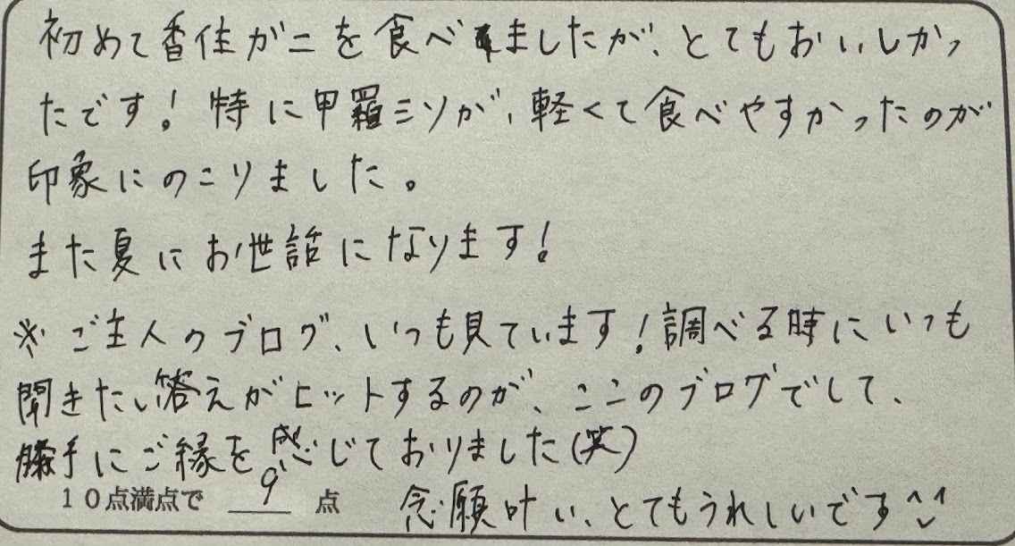 A様。この度は民宿かどやをご利用いただきまして、誠にありがとうございました。春のカニ、香住ガニに挑戦していただけたこと、大変嬉しく思います。こちらのカニも松葉ガニとはまた異なる味でお楽しみいただけたのではないでしょうか。また、当館のブログもご愛読いただき、ありがとうございます。こちらにお越しの際には是非是非直近の記事だけでも目を通してからお越しいただけると嬉しいです。これから夏の話題も増やしていきますね。次回、夏にご家族でお越しいただくこと、楽しみにしております。またのお越しをお待ちしております。ありがとうございました。