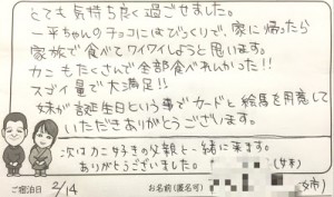 とても気持ち良く過ごせました。一平ちゃんのチョコにはびっくりで、家に帰ったら家族で食べてワイワイしようと思います。カニもたくさんで全部食べれんかった!!スゴイ量で大満足!!妹が誕生日という事でカードと絵馬を用意していただきありがとうございます。(姉)