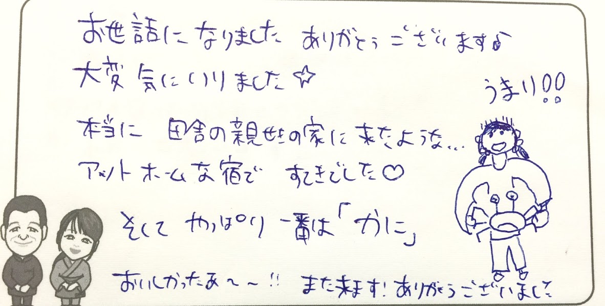 K様。この度は民宿美味し宿かどやをご利用いただきまして誠にありがとうございました。”親せきの家に来たようなアットホーム”というお言葉、とても嬉しいです!!とってもお寛ぎいただけたこと、そしてスタッフ一同がお客様との距離が近づいた感じがして、嬉しい気持ちでいっぱいになります。今回はカニのフルコース、食べきれないほどのボリュームだったかと思います。満足していただけて幸いです。
