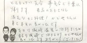 とてもいい気分夢気分で千葉に帰ります。最高のおもてなし。満足なカニ料理!かどやさんに来て本当に良かったです。前日は城崎温泉に泊まりましたが有名な城崎で泊まるよりかどやさんが良かったです。ありがとうございました!(千葉県W様 お友達旅行・3名女子旅 2016.3015 いい旅プラン”A”)