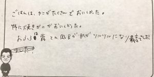 F様。この度は民宿美味し宿かどやをご利用いただきまして誠にありがとうございました。香住ガニ、ご満足いただけましたか?当館は焼きガニを熱々でお召し上がりいただけることが自慢の一つです。香ばしくジューシーな味わいをご堪能頂けましたら幸いです。お風呂も気に入っていただけたようでとても嬉しいです。秋のカニと冬のカニでまた味わいが違います。ぜひぜひまた冬の松葉ガニシーズンにもお越し下さいね。またのお越しをお待ちしております。ありがとうございました。