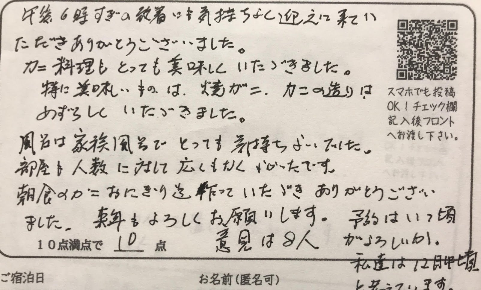 M様。この度は民宿かどや2度目のご来館、誠にありがとうございました。当館若手スタッフのこと、お褒めいただきありがとうございます!本人も励みとなりますので伝えますね。学校に入ると家族旅行は次第に難しくなっていくとか。今のうちにご家族様全員でのカニ旅行、是非是非定期的に実施して下さい。その際にはぜひまたかどやをご利用下さいませ。来シーズンもお待ちしております。ありがとうございました。