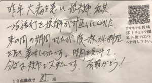 Y様。この度は民宿かどや2度目のご来館、誠にありがとうございました。今回は親子での快気祝い旅行だったとのこと。当館へのカニ旅行をお選びいただけたこと、とても嬉しいです!次回はお子さんもご一緒で3世代旅行ですね!ぜひぜひ皆さんで、あるいはそれぞれお時間ある時にカニを堪能しにお越し下さいね。来シーズンもお待ちしております。ありがとうございました。