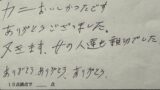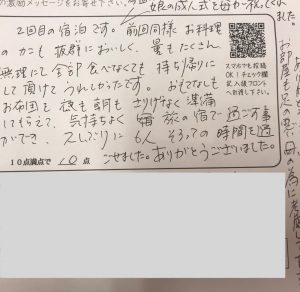 O様。この度は民宿かどや2度目のご来館、誠にありがとうございました。再び当館をお選び頂けた事。カニ料理、今回も満足していただけた事。何よりもご家族みなさんで娘さんの成人式をお祝いされる大切なお祝い旅行に当館をお選びいただけた事。とても嬉しく思います。これからも事前に言っていただければ、1室だけある下のお部屋をご用意できます。先着順となりますので、お早めにご相談下さい。来シーズンもぜひ皆さんでおこしくださいね。