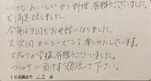 いつもおいしいカニ料理有難うございました。大満足致しました。今年は3回もお世話になりました。又次回カニシーズンを楽しみにしています。スタッフの皆様有難うございました。コロナに負けず頑張って下さい。(大阪府H様 大人の親子旅 2022.4.2. ぷりっぷり食感☆活柴山かにの刺身付!“いい旅プラン 基本P”<香住>)