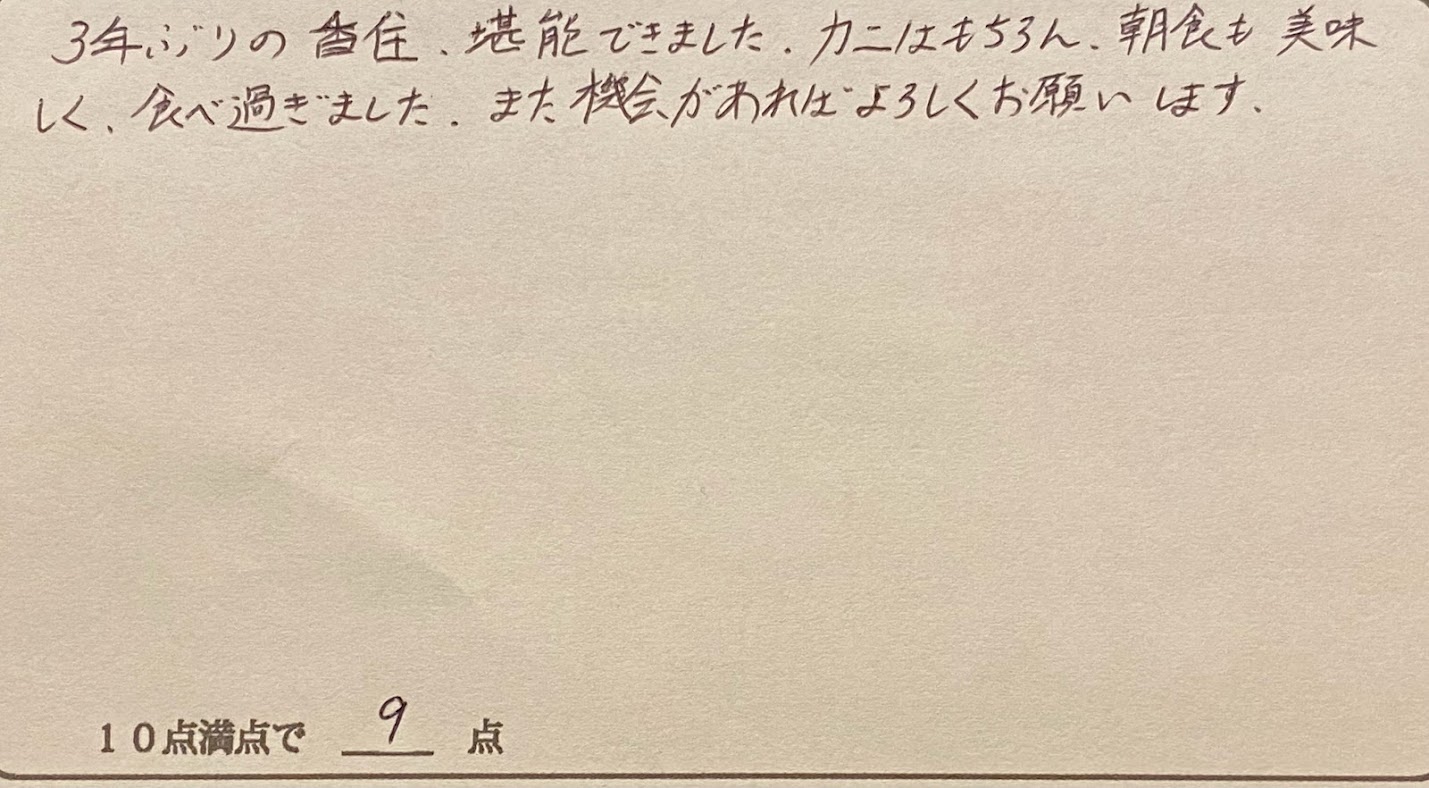 O様。この度は民宿かどやを初めてご利用いただきまして、誠にありがとうございました。3年ぶりの香住の宿として、当館をお選びいただきありがとうございます。2年以上続いているコロナ禍を経てのカニ旅行。当館のカニ料理、朝食、ご満足いただけたようで良かったです。毎年カニを食べに香住へ来られるような環境に早くなって欲しいですね。次回もぜひ投函へお越し下さいませ。またのお越しをお待ちしております。ありがとうございました。