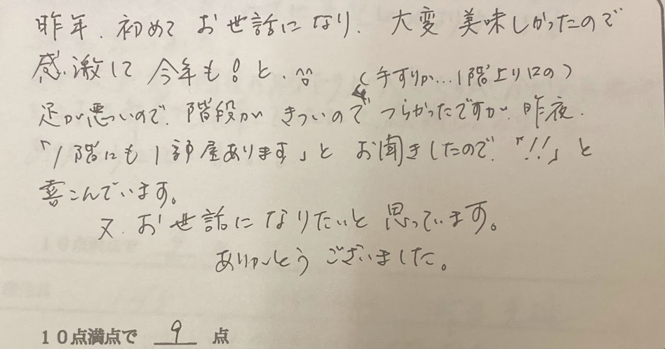 K様。この度は民宿かどや2度めのご来館、誠にありがとうございました。急な階段ではご不便をおかけし、申し訳ありませんでした。是非是非、次回以降予約時に「1階のお部屋で」とご指定下さい。1組様のみになりますが、先着順でご用意させていただきます。安心して美味しいカニをご堪能いただけましたら幸いです。来年、3階目のお越しをお待ちしております。ありがとうございました。
