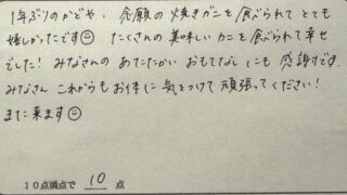 1年ぶりのかどや、念願の焼きガニを食べられてとても嬉しかったです☺ たくさんの美味しいカニを食べられて幸せでした!みなさんのあたたかいおもてなしにも感謝です。 みなさんこれからもお体に気をつけて頑張ってください! また来ます☺(兵庫県I様 大人の親子旅)