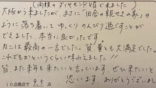 20年ほど前一度こちらに宿泊したことがあります。その時は長女だけで、その当日熱を出し調子をくずしてしまいました。その時親切に対応して頂き20数年前のリベンジにやってきました。今回はおもいっきりカニをたんのうできました。(大阪府K様 大人の親子旅)