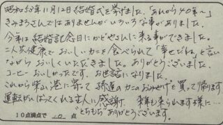 昭和58年11月12日結婚式を挙げました、「あれから40年〜」 きみまろさんではありませんが、いろいろな事がありました。 今年は結婚記念日にかどやさんに来る事ができました。 二人共健康でおいしいカニを食べられて「幸せだね」と言いながらおいしくいただきました。これから柴山港に寄って孫達のカニのおみやげを買って帰ります。