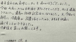 毎年変わらぬ美味しいカニをありがとうございました。今回お気に入りの日本酒をBYOさせていただき、カニを堪能できました。最高の結婚記念日になりました。又、今回から部屋に冷蔵庫が設置されていたので、ますます快適に適ごすことができました。今後も宜しくお願いします。
