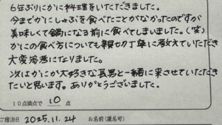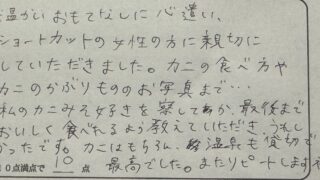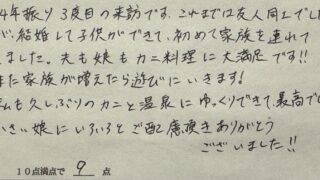 4年振り3度目の来訪です。これまでは友人同士でしたが、結婚して子供ができて、初めて家族を連れてきました。夫も娘もカニ料理に大満足です!!また家族が増えたら遊びにいきます!私も久しぶりのカニと温泉にゆっくりできて、最高でした。小さい娘にいろいろとご配慮頂きありがとうございました!