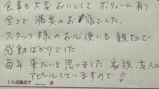 スタッフ様のお心便いも親切で感動ばかりでした。毎年来たいと思いました、家族、友人にもアピールしていますので!!(兵庫県M様 グループ旅行)