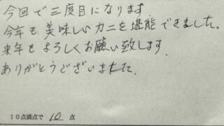 今回で三度目になります。今年も、美味しいカニを堪能できました。来年もよろしくお願い致します。ありがとうございました。(京都府T様 ご夫婦旅行 2025.12.3. 一度はしたかった贅沢!妻と温泉に入ってエエ蟹食べたい☆夫婦水入らずの口福旅☆特選柴山がにプラン)