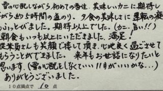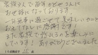 家族3人で毎年かどやさんにお世話になっております。 一年無事に過ごせて美味しいことおもてなしに感謝です!また家族で訪れるのを楽しみにしています!ありがとうございました。(兵庫県M様 大人の親子旅 2025.12.8. ぷりっぷり食感☆活柴山かにの刺身付!“いい旅プラン 基本P”<香住>)